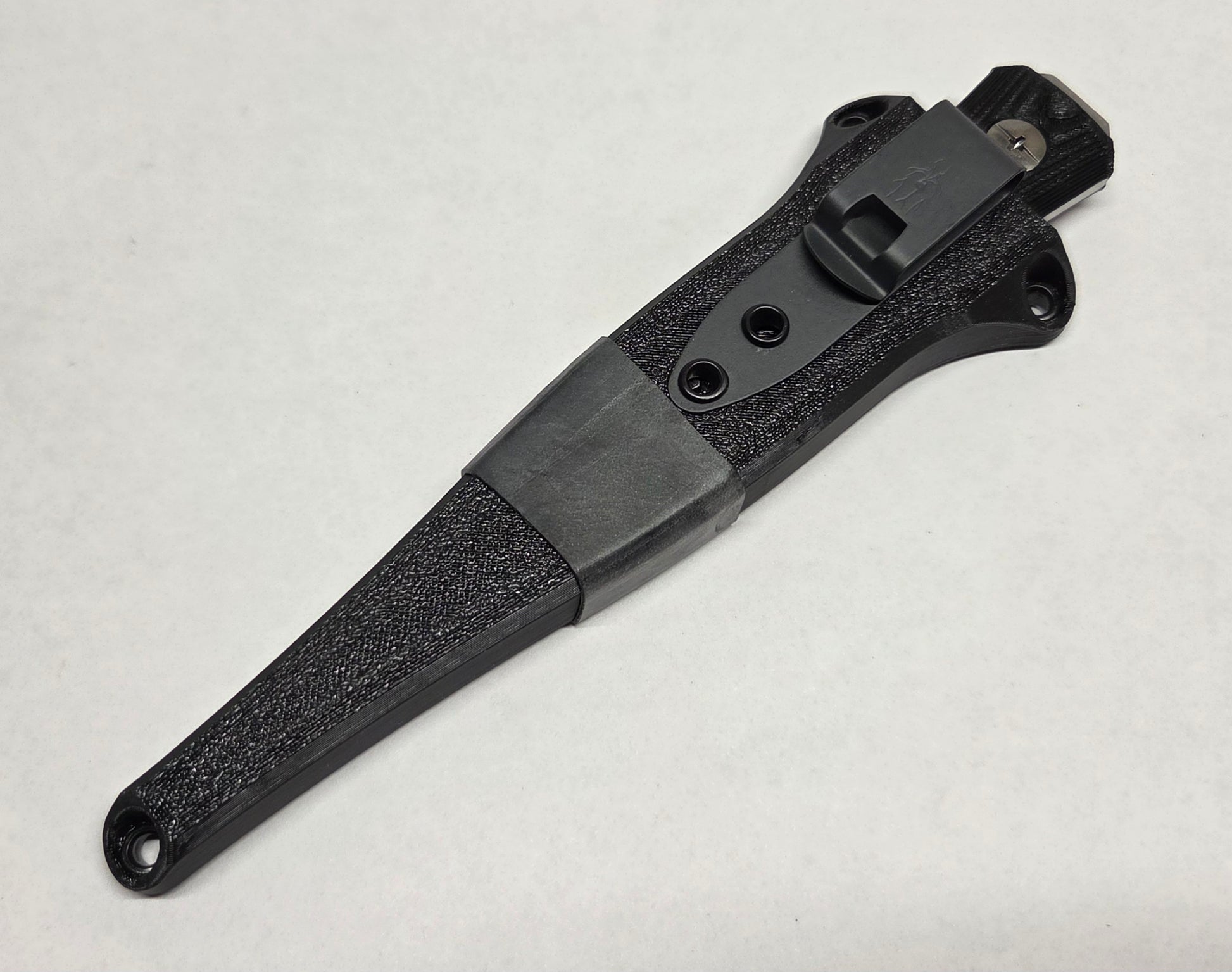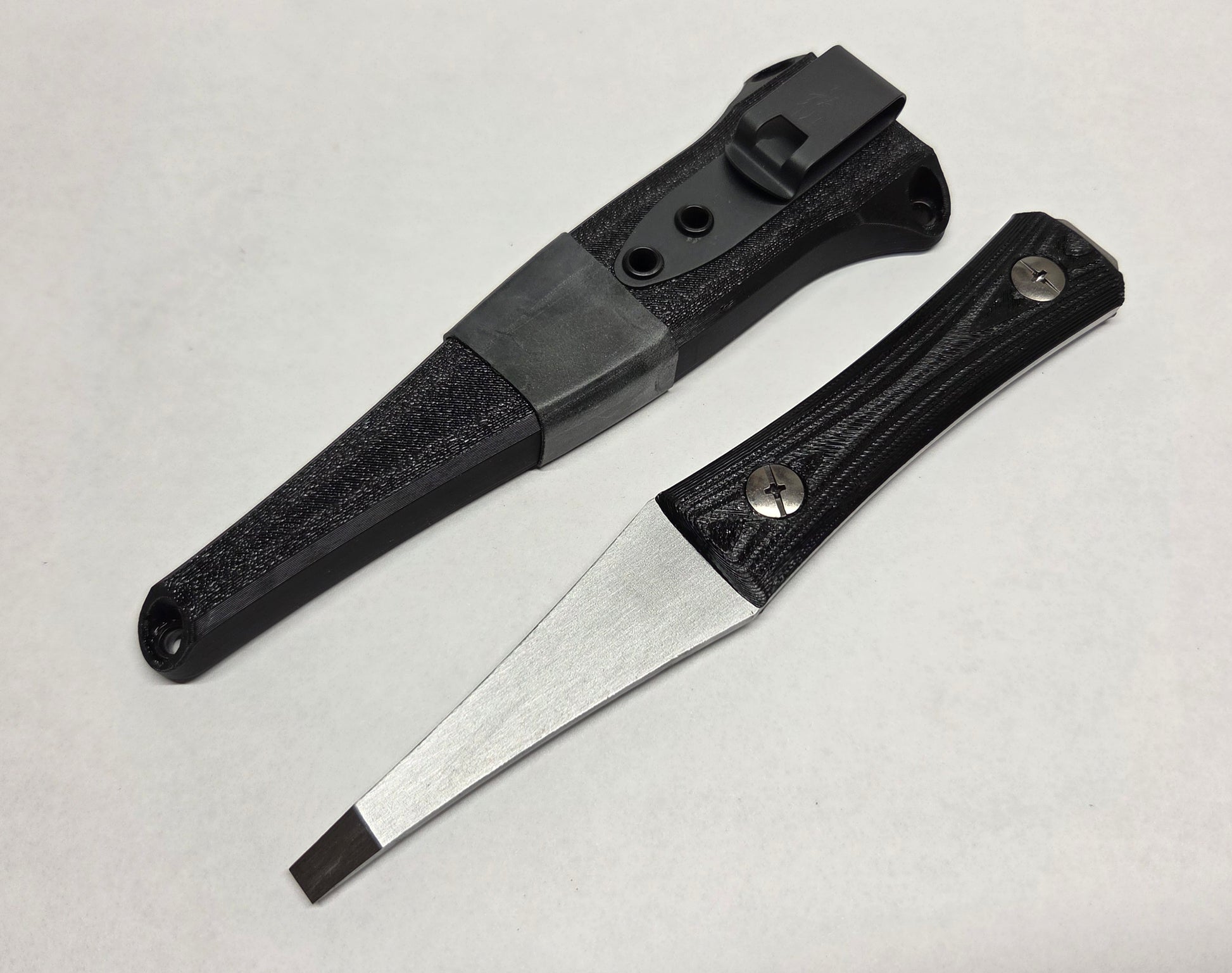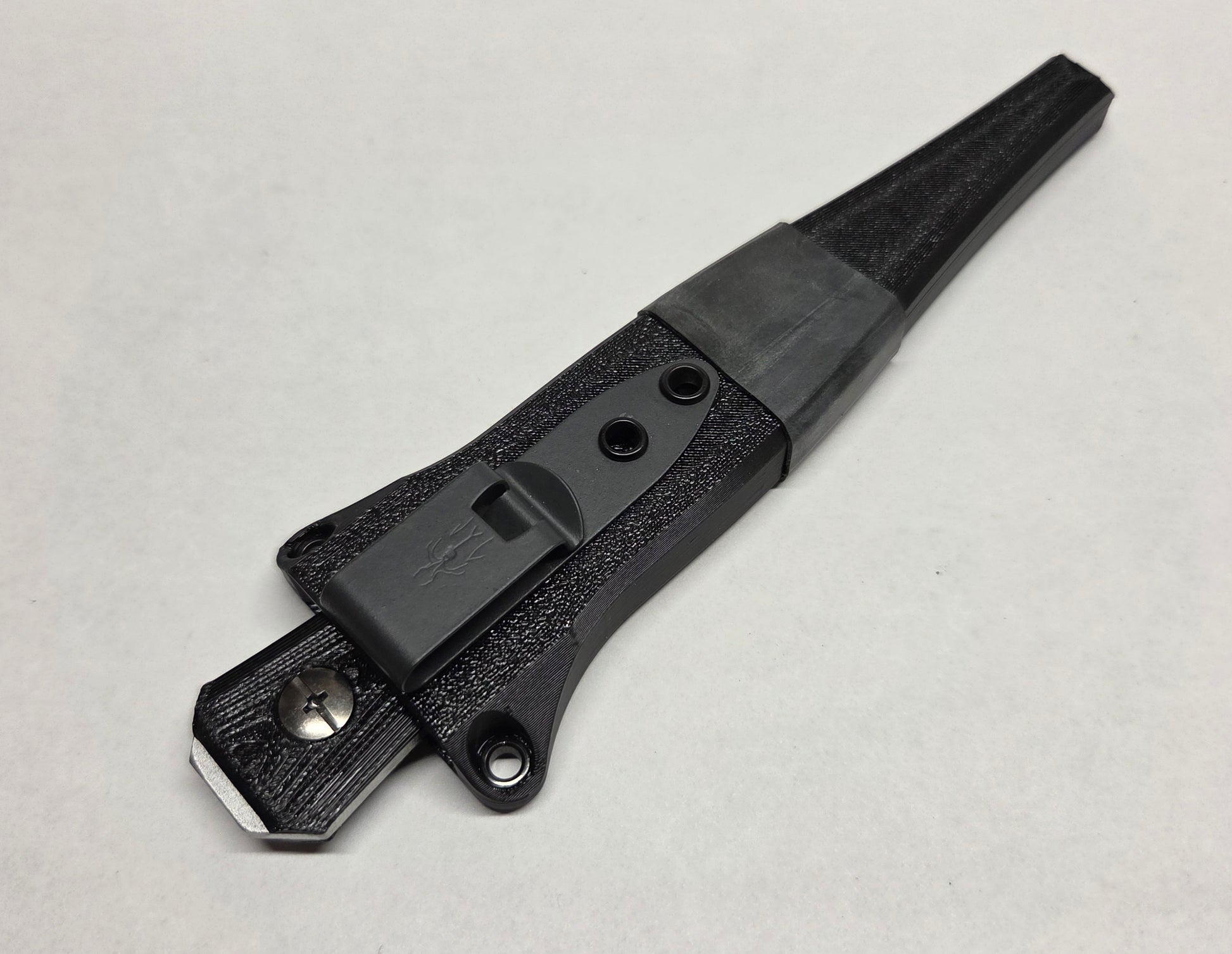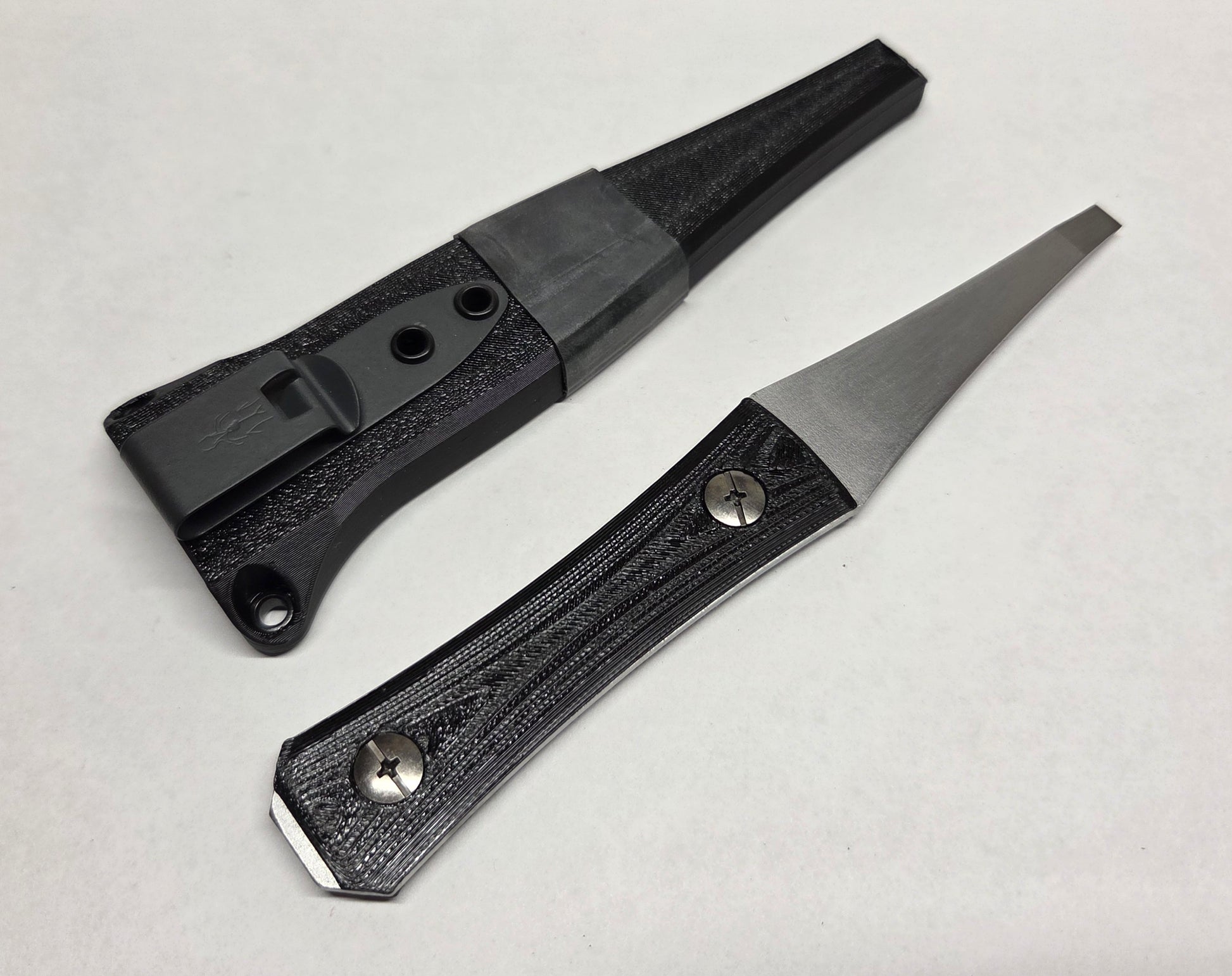 The pocket sheath is made of 2 3D printed PETG halves riveted together with a DCC Mod 2.2 pocket clip. It features a positive retention click to lock the prybar into place.